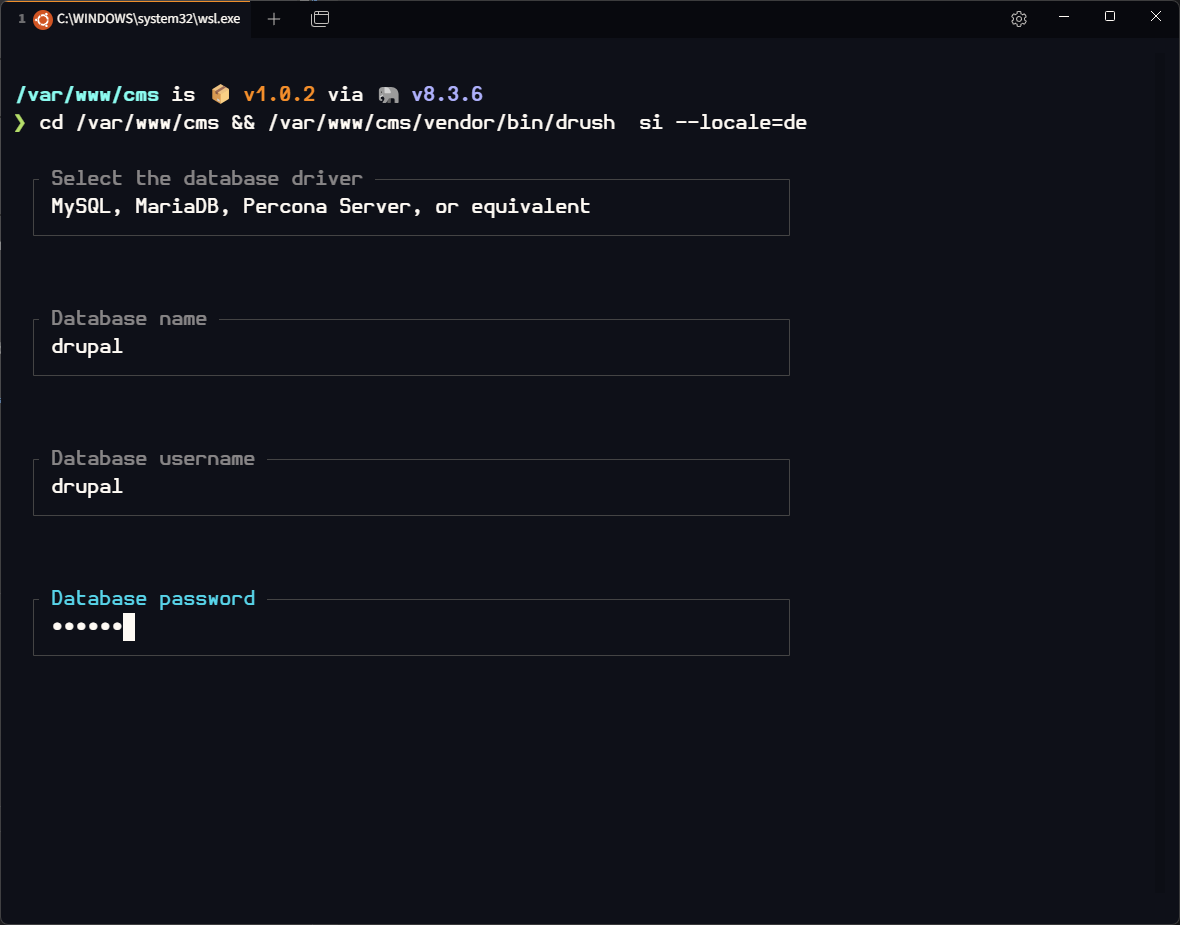 /var/www/cms/vendor/bin/drush -y si --db-url=mysql://drupal:drupal@localhost/drupal?module=mysql --locale=de --account-name=admin
