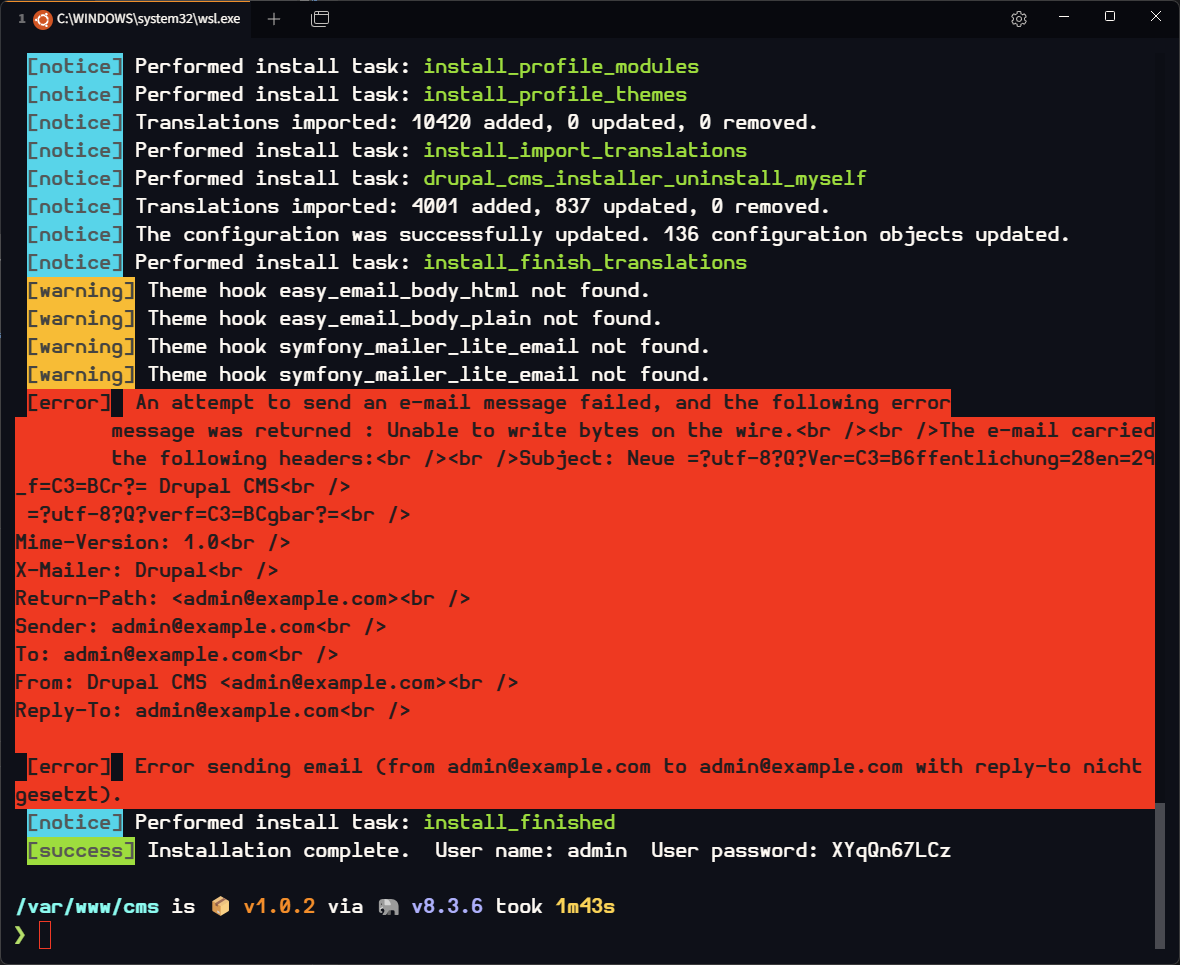 Ist die Installation abgeschlossen, teilt dir Drupal am Ende der Installation deinen Benutzernamen und ein zufällig erstelltes Passwort mit.
